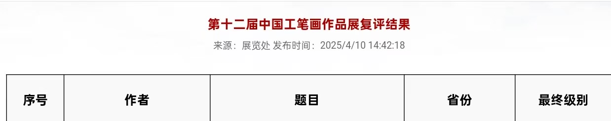 4月10日,中国美术家协会官网揭晓第十二届全国工笔画作品展复评结果。作为每五年举办一次的国家级艺术盛会,本届展览由中国美术家协会、中国工笔画学会与江苏省文化和旅游厅联合主办,竞争激烈——初评入围525件作品中,最终仅381件脱颖而出。